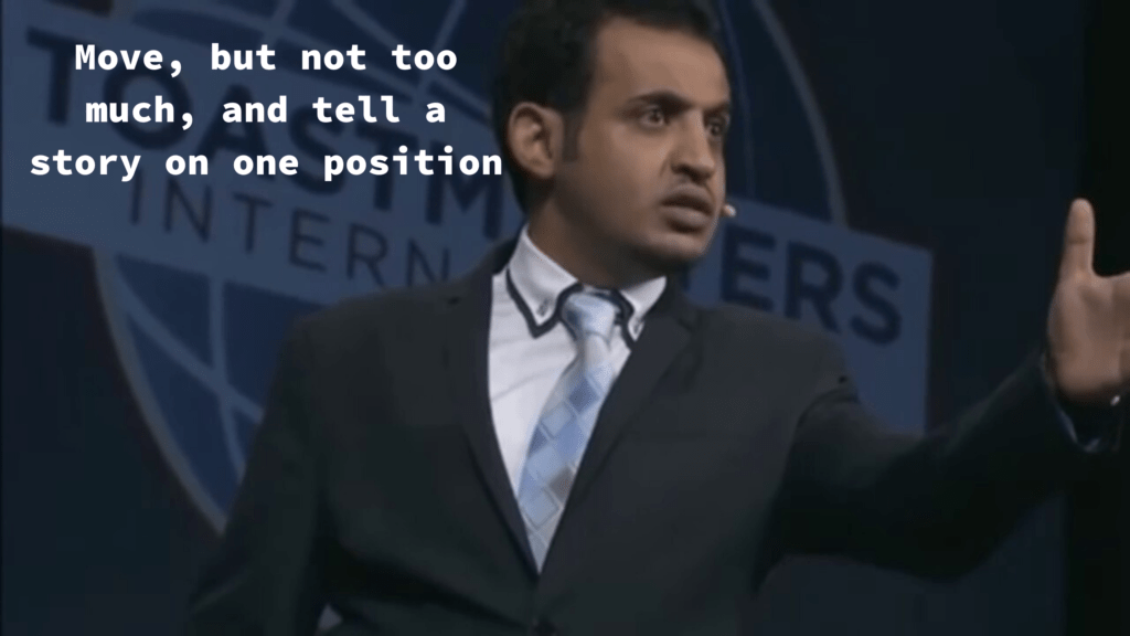 Moving around on stage can make a big difference. But you have to think about HOW and WHERE you move. Walk to a specific point and tell a story there. Don’t go running around!