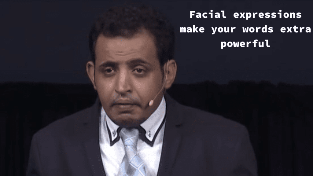 Yes, people CAN see your face! In fact, that’s what they look at most! And your face tells the audience how you really feel. Using facial expressions to show emotions is very powerful. Smile when you want to express happiness!